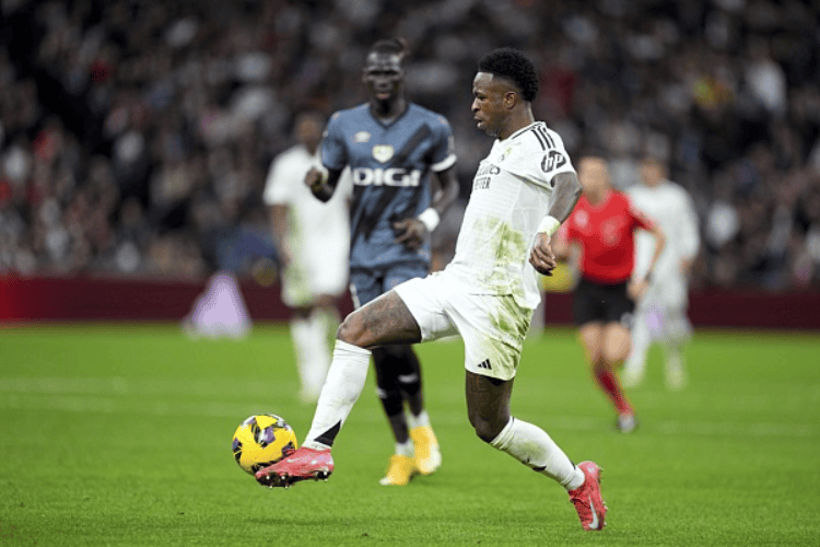 第34分钟,维尼修斯左侧连续突破摆脱防守进入禁区,踩单车后闪开小角度推射,皮球打在防守球员腿上变线入网,皇马扩大比分,2-0