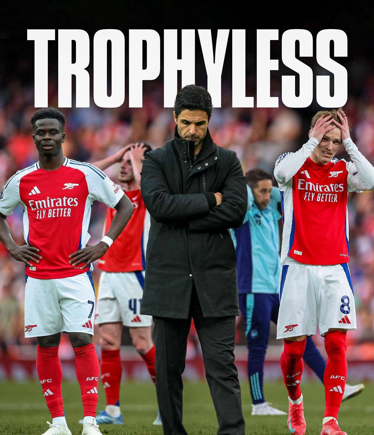 从2025年初开始,阿森纳连续遭遇挫败,接二连三的失利让球队士气大受打击。1月13日,足总杯十人曼联通过点球大战战胜阿森纳,止步32强;2月6日,纽卡斯尔在联赛杯中以2比0击败阿森纳,总比分4比0晋级决赛;4月27日,利物浦在英超中以5比1击败热刺,提前夺冠。而在令人心碎的欧冠比赛中,巴黎以总比分3比1战胜阿森纳,令此前的希望变为泡影。