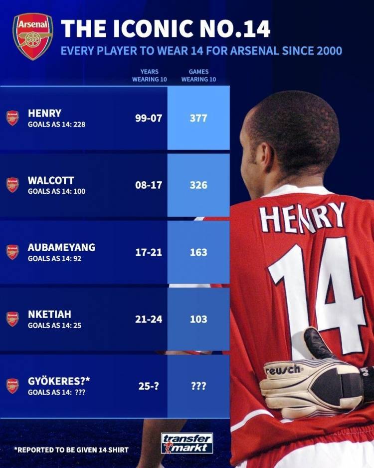 直播吧7月25日讯 多方消息确认,约克雷斯将转会阿森纳,他还将接手传奇的14号球衣。《转会市场》也列出了阿森纳14号在新世纪的主人:亨利(99-07):377场,228球沃尔科特(08-17):326场,100球奥巴梅扬(17-21):163场,92球恩凯提亚(21-24):103场,25球...